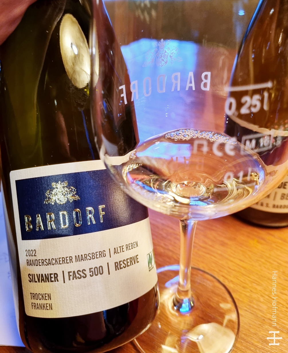 Zum Wein mal noch allgemein etwas: Die Silvaner-Reben stehen im sehr bekannten Marsberg und haben 2023 ihren 50. Geburtstag gefeiert. Gelesen wurde am Beginn des 3. Drittels im Oktober, 12 Stunden Maischstand und anschließend per Ganztraubenpressung ins Stahl gelegt und dort 3 Monate vergoren. Anschließend wurde er in ein neues französisches Tonneau aus französischer Eiche (36 Monate gelagertes Holz) gelegt und dort 1 Jahr auf der Hefe ausgebaut – im Grunde eine tolle Anlage !